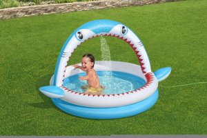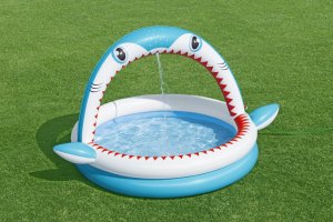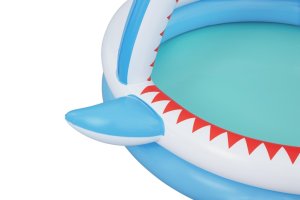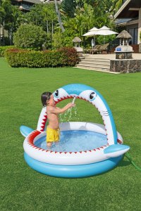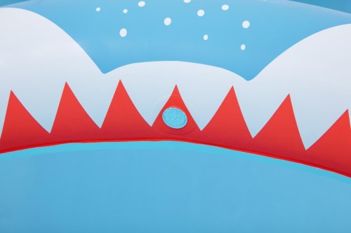 Dizajn bazénika je veľmi atraktívny a pútavý, pripomína žraloka s modrobielou farbou, červenými zubami a výraznými očami. Bazénik má nafukovací oblúk v tvare žraločej papule, ktorý je vybavený spŕškou. Stačí len pripojiť záhradnú hadicu k ventilu na oblúku a voda začne striekať, čo deťom prináša osviežujúci zážitok a zábavu počas horúcich dní. Oblúk je stabilne upevnený a jeho dizajn zahŕňa aj malé plutvy po stranách bazénika, ktoré dodávajú vzhľadu hravú a tematickú podobu.
