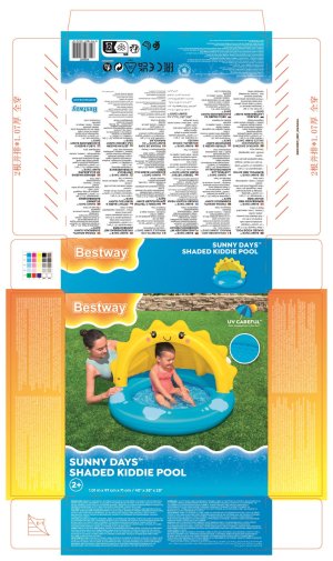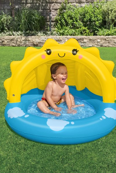 Výrazným prvkom je žltá nafukovacia strieška v tvare usmievavého slniečka s roztomilými tvárami, ktorá slúži ako ochrana proti priamemu slnečnému žiareniu. Strieška je pevne pripevnená k bazénu a zaisťuje tak tieň a bezpečie počas hravých chvíľ na čerstvom vzduchu. Tento prvok je nielen funkčný, ale aj estetický, čím zvyšuje atraktivitu bazéna pre deti aj rodičov.
