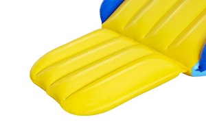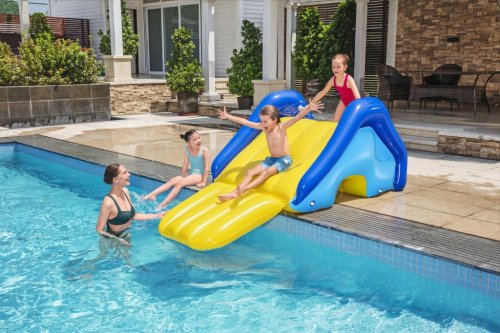 Jednoducho ho položte na okraj vášho bazéna a pripojte vodnú hadicu, aby ste aktivovali vstavané postrekovače a naplnili 4 vodné komory, aby bola šmykľavka stabilná. Nosnosť 69 kg. Rozmery šmykľavky sú 247 × 124 × 100 cm a súčasťou balenia je opravná záplata.