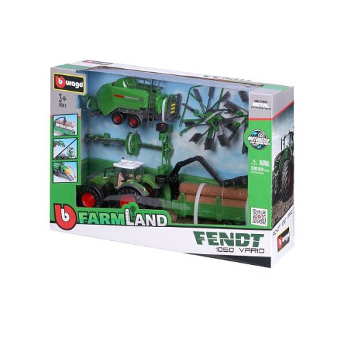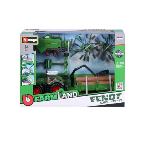 Modely traktorov so zotrvačníkom v darčekovej sade s tromi prívesmi z kolekcie Farmland sú zbierkou modelov s vysokým dôrazom na presnosť detailov. Modely o veľkosti 10 cm sú vyrobené z liateho kovu s plastovými detailmi. Set FENDT 1050 VARIO obsahuje model traktora, príves na prepravu dreva s nakladačom, príves s rotačnými hrabľami a príves s balíkovačkou sena. Balené v krabičke. Nevhodné pre deti do 3 rokov. Rozmery balenia: 21,6 x 31,8 x 9,1 cm. Vek: 3+