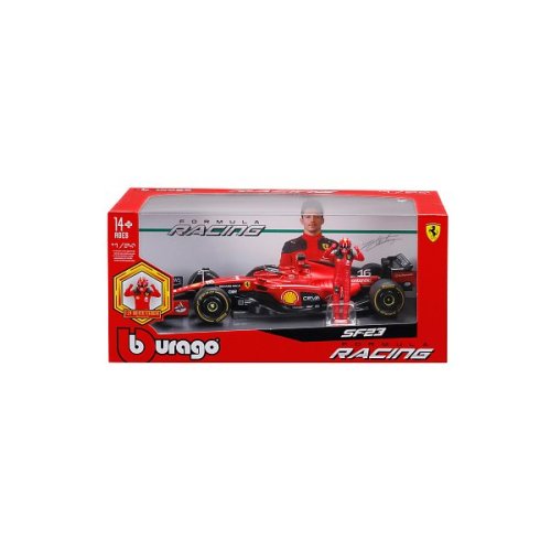 Bburago modely závodných vozidiel Formule 1 v mierke 1:24 z kolekcie FORMULA RACING sú zbierkou krásneho designu s vysokým dôrazom na presnosť detailov. Súčasťou modelov je plastová figúrka jazdca F1 v majstrovskej póze. Modely F1 zo stajne Ferrari SF-23 (2023) sú vyrobené z liateho kovu s plastovými detailmi. Každý z modelov je v klasickom závodnom designe a so závodným číslom. Balené v krabičke. Nevhodné pre deti do 3 rokov. Rozmery balenia: 12,7 x 28 x 12,7 cm. Vek: 14+