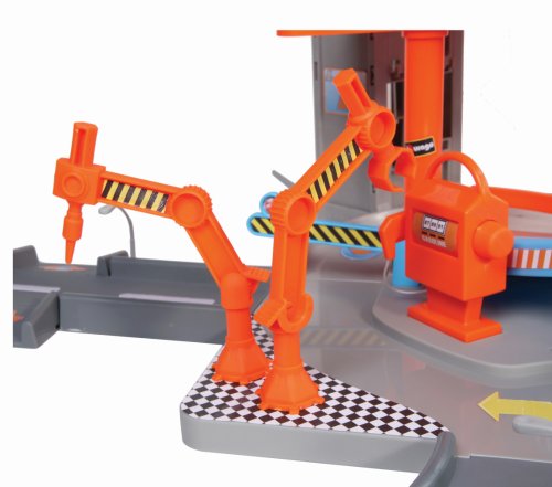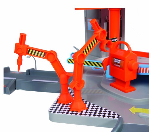 Táto niekoľkoposchodová garáž Bburago s umývačkou v sebe skrýva mnoho funkčných prvkov! Vyvez autíčko výťahom až do najvyššieho poschodia garáže a spusti ho dole po ceste! Zastav sa v servise, umy auto v umývačke a prejdi zdvíhacími závorami!