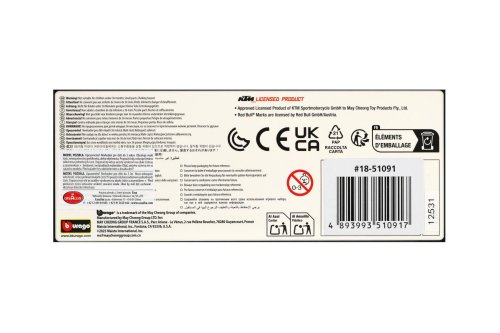 Modely motocyklov Bburago v mierke 1:18 z kolekcie RED BULL KTM FACTORY RACING sú zbierkou Rallye modelov s vysokým dôrazom na presnosť detailov. Modely sú vyrobené z liateho kovu s plastovými detailmi. Balené v krabičke. Nevhodné pre deti do 3 rokov. Rozmery balenia: 10,8 x 17,1 x 7,1 cm. Vek: 3+