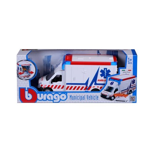 Modely technických a upratovacích vozidiel Bburago z kolekcie Municipal Vehicle sú zbierkou modelov s vysokým dôrazom na presnosť detailov a funkčnými prvkami. Ambulancie má otváracie zadné dvere a interiér vo vnútri ako v pravej záchrannej službe. Modely sú vyrobené z liateho kovu s plastovými detailmi. Balené v krabičke. Nevhodné pre deti do 3 rokov. Rozmery balenia: 9 x 22,1 x 6,7 cm. Vek: 3+