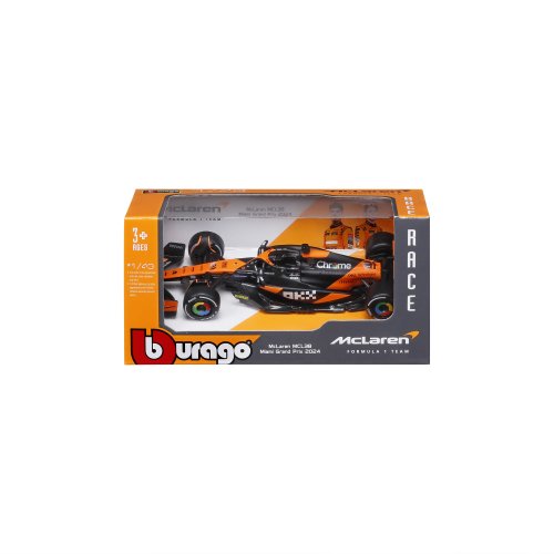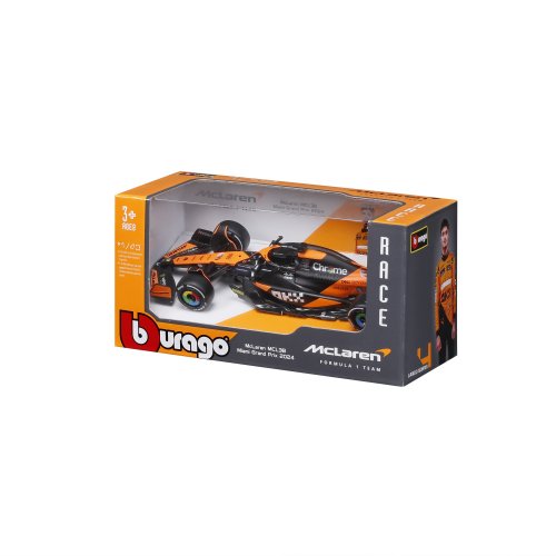 Bburago modely závodných vozidiel Formule 1 v mierke 1:43 z kolekcie RACE sú zbierkou krásneho designu s vysokým dôrazom na presnosť detailov. Modely F1 zo stajne McLaren MCL38 (2024) v špeciálnej Senna Edition sú vyrobené z liateho kovu s plastovými detailmi. Každý z modelov je v klasickom závodnom designe a so závodným číslom. Balené v krabičke. Nevhodné pre deti do 3 rokov. Rozmery balenia: 6,7 x 14,7 x 7,5 cm. Vek: 3+