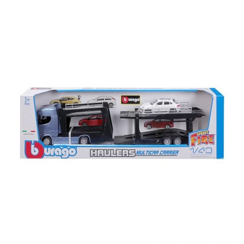 Modely kamiónov v mierke1:43 Multicar Carrier s návesom na prepravu áut z kolekcie Street Fire sú zbierkou modelov s vysokým dôrazom na presnosť detailov. Modely sú vyrobené z liateho kovu s plastovými detailmi. Každý z kamiónov je doplnený jedným modelom osobného automobilu. V prepravnom návese môžu malí vodiči prevážať až päť autíčok z kolekcie Street Fire. Balené v krabičke. Nevhodné pre deti do 3 rokov. Rozmery balenia: 15,5 x 52,1 x 11,8 cm. Vek: 3+