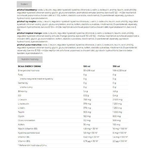 Obľúbený drink s vysokým obsahom BCAA, obohatený o kofeín, taurín a vitamíny skupiny B. Drink je vyrobený z čistej artézskej vody NARTES v niekoľkých sviežich príchutiach, ktoré si obľúbite kedykoľvek počas dňa alebo pri športovej aktivite. Vďaka zmesi účinných látok a vitamínom skupiny B, prispieva k zmierneniu únavy. Navyše je úplne bez cukru. 5 000 mg BCAA 100 mg kofeínu 1 000 mg taurínu vitamíny B3, B5, B6, B12 znovu-uzatvárateľná fľaša bez konzervantov bez cukru z čistej artézskej vody Odporúčané dávkovanie: maximálne 1 fľaša za deň, 20 – 30 minút pred alebo v priebehu . Použitie: po otvorení je výrobok určený na okamžitú spotrebu. Upozornenie: Sýtený ochutený nealkoholický nápoj s prídavkom BCAA, kofeínu a vitamínov, so sladidlom. S vysokým obsahom kofeínu (30 mg/100 ml) – nie je vhodný pre deti a tehotné alebo dojčiace ženy. Chráňte pred teplom, mrazom, vlhkosťou a priamym slnečným žiarením. Dodávateľ: NUTREND DS ., as ., Chválkovice 604, 779 00 Olomouc, Česká republika