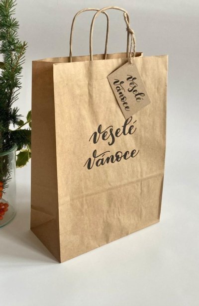 Be Nice darčeková taška s menovkou. Ste praktickí a nechcete na balenie darčekov spotrebovať veľké množstvo papiera? Jednoducho ich vložte do darčekovej tašky s vianočným textom a menovkou. Obdarovaný vďaka tomu bude mať všetky darčeky na jednom mieste. A vianočný bonus nakoniec: taška je vyrobená z prírodného hnedého papiera, doplnená peknou menovkou a môžete ju použiť opakovane. Potlač Veselé Vianoce napísala česká ilustrátorka Bára z Nikolajky.