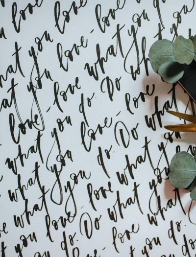 Be Nice EKO baliaci papier písmo s citátom do what you love - love what you do na bielom papieri. Originálne motívy vytvorila česká ilustrátorka Bára z Nikolajky.