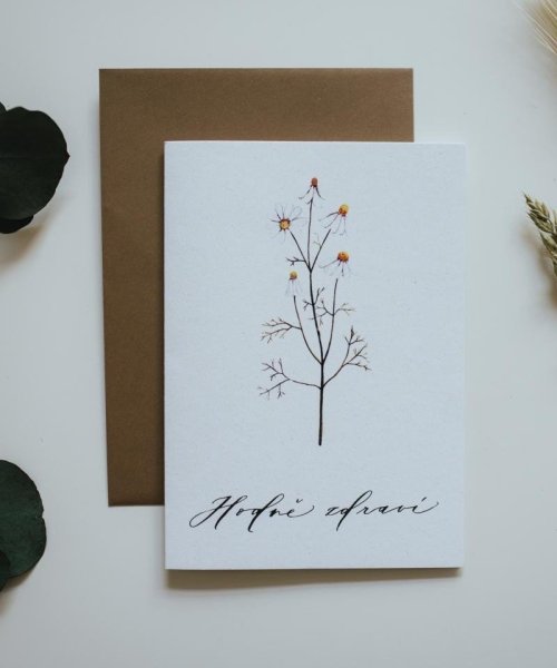 Be Nice ekologické prianie Veľa šťastia a zdravia - s originálnym dizajnom českej bylinky harmanček. Prianie ilustrovala česká výtvarníčka Bára z Nikolajky. Rozmer: 12 x 17 cm