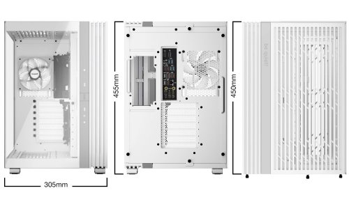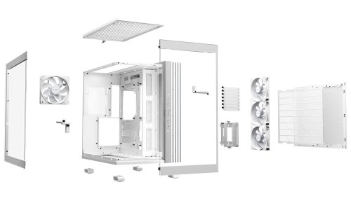 Unikátna počítačová skriňa s priehľadnou bočnicou aj predným panelom formátu Middle Tower ponúka dostatok priestoru pre montáž väčšiny dostupných komponentov. Hlavnou prednosťou tejto skrine je možnosť rýchlej zmeny jej orientácie vďaka systému odnímateľných a premiestniteľných nožičiek . Skriňa je dodávaná so štyrmi predinštalovanými 120mm ventilátormi s ARGB podsvietením . K tomu ponúka ďalších až 6 pozícií pre ventilátory a dva integrované rozbočovače ventilátorov a ARGB . Na prednom paneli sa nachádzajú dva porty USB 3.0 , jeden port USB-C , slúchadlový výstup a audio vstup pre mikrofón. Herný dizajn ešte dopĺňa elegantné ARGB osvetlenie lemujúce strany skrine, vďaka čomu je viditeľné bez ohľadu na to, v akej orientácii skriňu používate. V skrini je dostatok priestoru pre chladič CPU do výšky až 170 mm a grafickú kartu s dĺžkou až 400 mm. Dômyselné riešenie umožňuje pohodlné umiestnenie až 360 mm dlhého výmenníka vodného chladenia na hornej alebo spodnej strane. Poteší tiež prítomnosť prachových filtrov či integrovaná podpera grafickej karty . Skriňa je dodávaná bez zdroja .