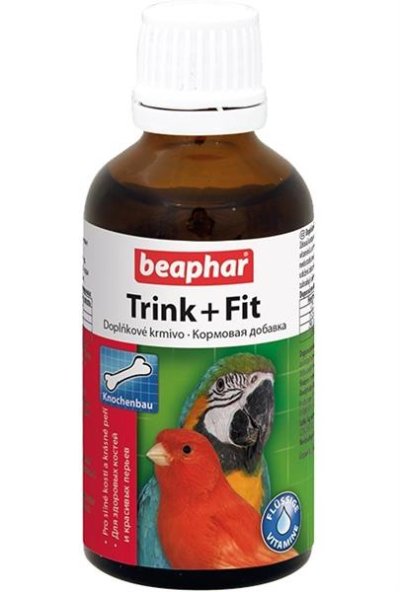 Vitamínové kvapky pre vtáctvo - preventívna starostlivosť v podobe kvapiek zaisťujúcich zdravý kostrový systém a prekrásne perie. Nevyhnutný doplnok stravy, v ktorej chýba vitamín C a vápnik. Obsahuje extrakt z černíc. Zloženie: Voda, cukry (glukóza min. 4 %), minerály, mlieko a mliečne produkty, černicový koncentrát (min. 0,1%). Analytické zložky: Vlhkosť 81,4%, vápnik 5,2%, Vit.C 200 mg/L. Použitie: Zmiešajte 15 kvapiek výrobku Trink Fit s 20 ml pitnej vody. Vymieňajte každý deň. Odstráňte z klietky ďalšiu vodu (pitnú, kúpaciu).