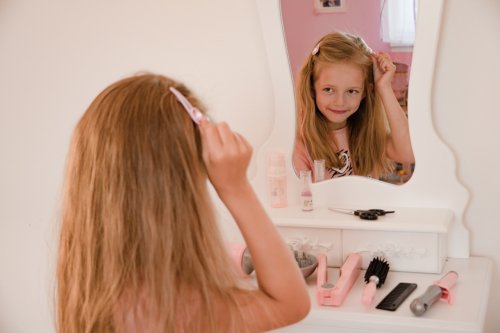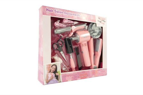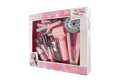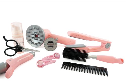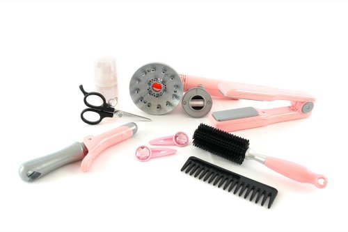 Sada pre kaderníčky v trendovej šedo-ružovej farbe obsahuje kulmu, fén na batérie s difuzérom, nožnice, hrebienok, kefu, žehličku na vlasy, sponky, sprej na vlasy.