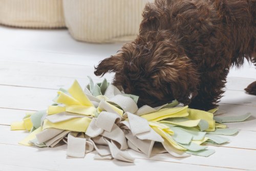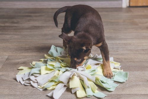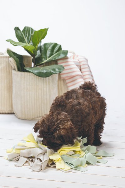 Koberček ponúka Vášmu šteniatku veľa výziev. Možno ho použiť na ukrytie psích sušienok alebo iných maškrtiek. Podložka sa skladá z rôznych farebných povrázkov, krátkych aj dlhých. Vďaka tejto štruktúre bude musieť šteniatko vynaložiť veľké úsilie, aby maškrty našlo, čo ho zmysluplne zamestná na dlhú dobu. Koberček je vyrobený z mäkkého flísu, takže je pre ňufáčik Vášho šteňaťa veľmi príjemný.