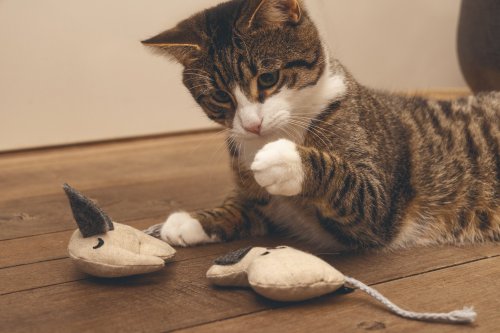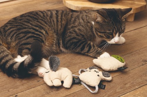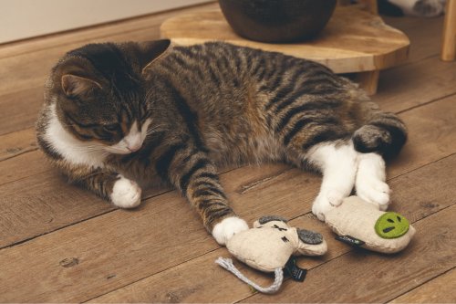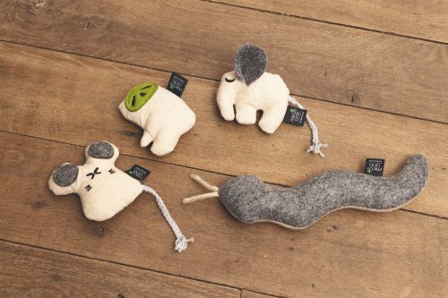Táto mačacia hračka je nielen zábavná, ale taktiež boli použité materiály šetrné k životnému prostrediu. Tieto hračky sú vyrobené z ľanovej bavlny a plsti REPREVE: 70% polyester a 30% polyester REPREVE. Hračky pre mačky sú plnené polyesterovým vláknom REPREVE a catnipom. REPREVE je najdôveryhodnejšie vlákno v obore, vyrobené z recyklovaných materiálov (vrátane plastových fliaš). Catnip v tejto myške robí hru extra zaujímavou a spúšťa poľovný inštinkt. Catnip dokáže uvoľniť aj stresované mačky.