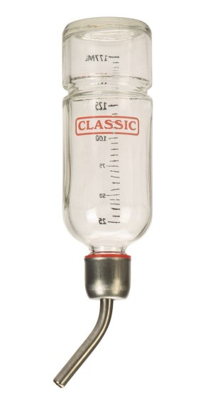 Klasická napájačka je vyrobená z tvrdeného skla a poskytuje Vášmu maznáčikovi dostatok čerstvej vody. Jednoducho sa pripevní na klietku pomocou upevňovacieho drôtika. Súčasťou je malá mrkvička, ktorá Vám na prvý pohľad ukáže, či má Váš maznáčik dostatok vody. Nerezové náustok s guličkou zabraňuje presakovaniu. Objem: 175 ml.