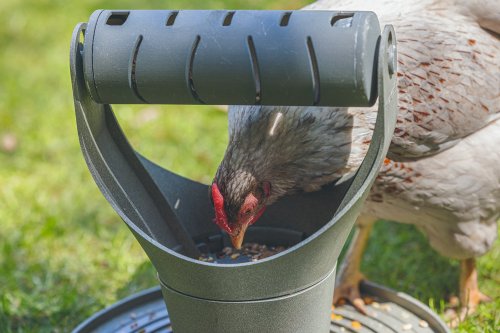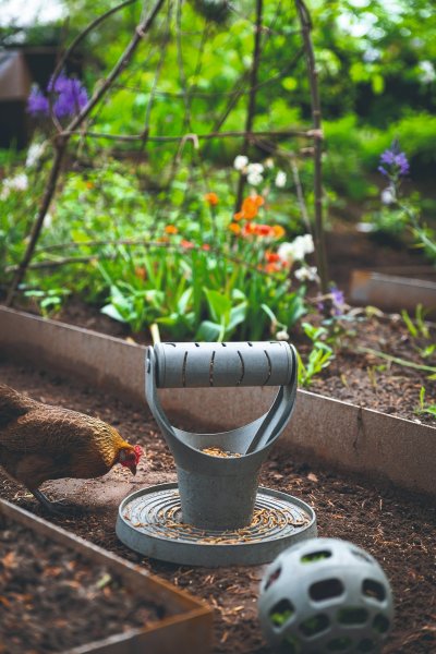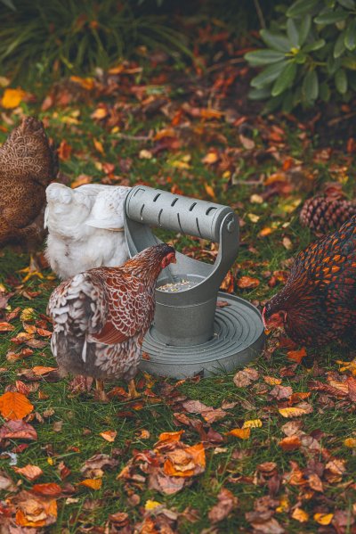 Kŕmiaca veža ponúka kurčatám a sliepkam aj zábavnú výzvu v podobe otáčavého valca, ktorý je možné naplniť krmivom. Pokiaľ doň správne lovia, budú okamžite odmenené.