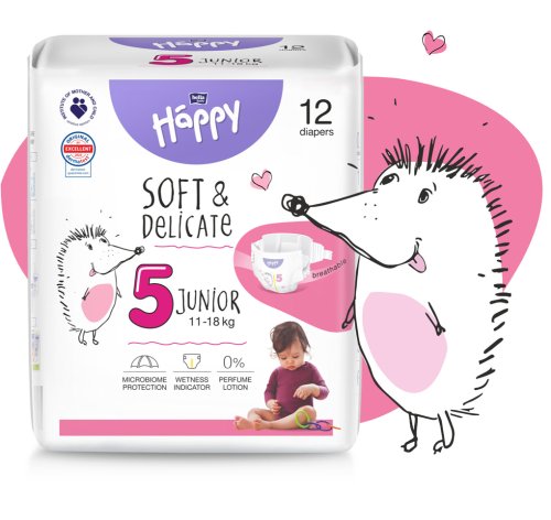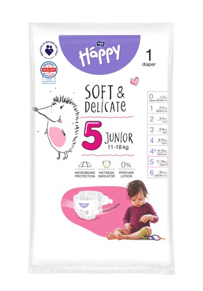 Detské plienky Happy Soft & Delicate Junior (5) sú odporúčané pre novorodencov s hmotnosťou 15 a viac kilogramov. Sú vyrobené z najkvalitnejších materiálov, dokonale sa prispôsobia telu dieťaťa a poskytujú príjemný pocit sucha. Sú navrhnuté tak, aby vyhovovali potrebám tej najcitlivejšej pokožky – neobsahujú žiadne alergény a minimalizujú riziko vzniku zaparenín.