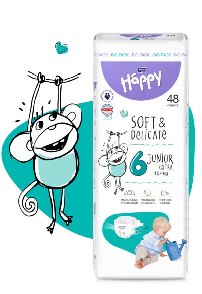 Detské plienky Happy Soft & Delicate Junior Extra (6) sú odporúčané pre novorodenca s hmotnosťou 11-18 kg. Sú vyrobené z najkvalitnejších materiálov, dokonale sa prispôsobia telu dieťaťa a poskytujú príjemný pocit sucha. Sú navrhnuté tak, aby vyhovovali potrebám tej najcitlivejšej pokožky – neobsahujú žiadne alergény a minimalizujú riziko vzniku zaparenín.