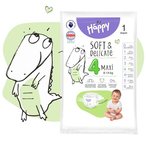 Detské plienky Happy Soft & Delicate Maxi (4) sú odporúčané pre novorodenca s hmotnosťou 8-14 kg. Sú vyrobené z najkvalitnejších materiálov, dokonale sa prispôsobia telu dieťaťa a poskytujú príjemný pocit sucha. Sú navrhnuté tak, aby vyhovovali potrebám tej najcitlivejšej pokožky – neobsahujú žiadne alergény a minimalizujú riziko vzniku zaparenín.