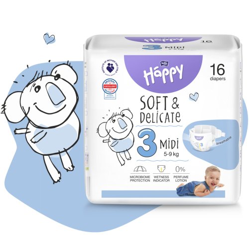 Detské plienky Happy Soft & Delicate Midi (3) sú odporúčané pre novorodencov s hmotnosťou 5-9 kg. Sú vyrobené z najkvalitnejších materiálov, dokonale sa prispôsobia telu dieťaťa a poskytujú príjemný pocit sucha. Sú navrhnuté tak, aby vyhovovali potrebám tej najcitlivejšej pokožky – neobsahujú žiadne alergény a minimalizujú riziko vzniku zaparenín.