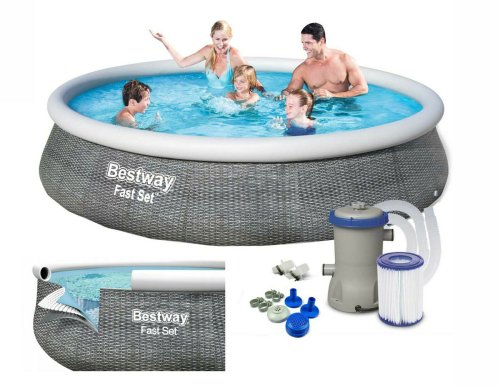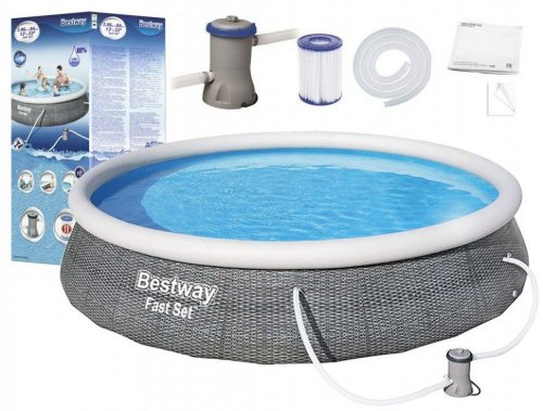 Bestway® Kruhový bazén Ø 396 x 84 cm s kartušovou filtráciou z kolekcie bazénov Fast Set. Rýchla a jednoduchá montáž - stačí si vybrať rovnú plochu, nafúknuť horný prstenec, napustiť bazén vodou a behom chvíľky sa budete kúpať. Sada obsahuje filtračné čerpadlo a filtračnú vložku, ktorá udržuje vodu čerstvú a čistú. Dodáva sa tiež s vypúšťacím ventilom na reguláciu prietoku, ktorý umožňuje rýchle vypustenie na konci sezóny. Pre Bestway Fast Set Pool nie sú potrebné žiadne náradie. Tieto bazény sa ľahko zostavujú a konštruujú z odolných materiálov a zaisťujú, že letná zábava bude trvať celú sezónu. TRITECH® Bazénová vložka z robustného, 3-vrstvového materiálu. Tento 3-vrstvový pevný materiál kombinuje PVC a sieťovinu a vytvára odolný materiál, ktorý je vystužený pre pevnosť a odolnosť proti prepichnutiu. Jednoduché zostavenie - jednoducho vybaľte, postavte, nafúknite a naplňte. Obsah sady: 1 bazén, 1 filtračné čerpadlo (220-240 V) s kompatibilnou kazetou 58094, 1 záplata na opravu pod hladinou vody. Rozmery bazéna: Ø 396 x 84 cm. Maximálna kapacita vody (80 %): 7340 litrov. Použitie pre deti vždy pod dozorom dospelej osoby. Rozmery balenia: 76 x 31 x 31 cm