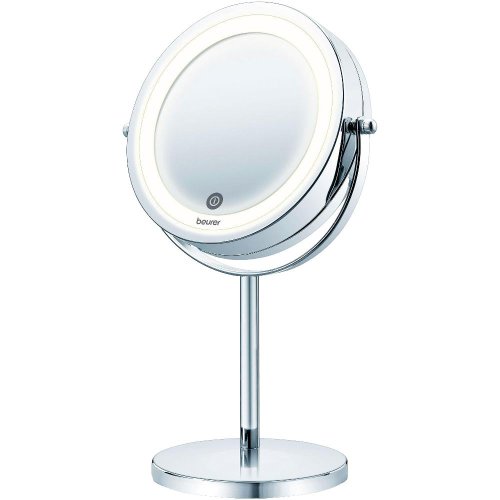 Zrkadlo má dve otočné zrkadlové plochy - jednu pre normálne zobrazenie a druhú so 7násobným zväčšením pre detailnú prácu Priemer zrkadlovej plochy je 13 cm, čo poskytuje dostatočný priestor pre precízne líčenie alebo starostlivosť o pleť Kozmetické zrkadlo Beurer BS 55 je vybavené aj funkciou automatického vypnutia po 15 minút Zrkadlo je napájané 4 batériami typu AAA, ktoré sú súčasťou balenia