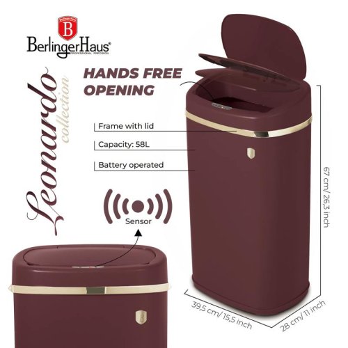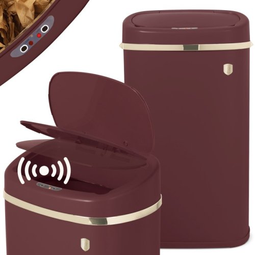 Tento senzorový odpadkový kôš v elegantnej matnej bordeaux farbe kombinuje moderné technológie s praktickým designom. Vďaka infračervenému senzoru sa veko otvára automaticky pri priblížení, čo zaisťuje hygienické používanie bez nutnosti dotyku. Štýlový zlatý poistný krúžok a kovové prevedenie dodávajú košu luxusný vzhľad vhodný do každej modernej domácnosti.
