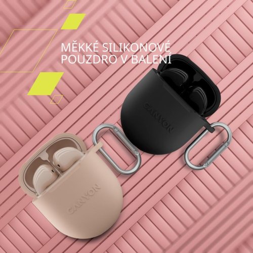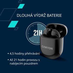 Bezdrôtové stereo slúchadlá Canyon TWS-6 s Bluetooth 5.3 ponúkajú 21 hodín výdrže, nízku hernú latenciu, automatické párovanie a pohodlné uchytenie pre skvelý zvukový zážitok na cestách.