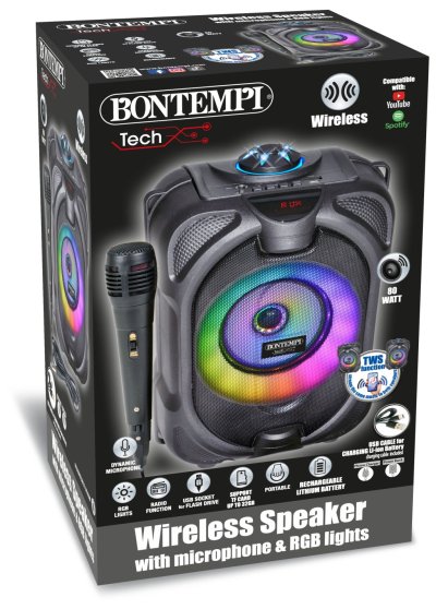 Multifunkčný bezdrôtový reproduktor ideálny pre karaoke, oslavy aj domácu zábavu. Súčasťou je dynamický mikrofón pre spev a hovorené slovo. Farebné svetelné efekty vytvárajú skvelú atmosféru a integrovaný displej zobrazuje informácie o prehrávaní alebo režime zariadenia. Reproduktor sa ľahko pripája cez Bluetooth, ponúka kvalitný zvuk a je vhodný pre vnútorné aj vonkajšie použitie. Perfektná voľba pre celú rodinu. Nabíjací kábel pre lítiové batérie typ C súčasťou.