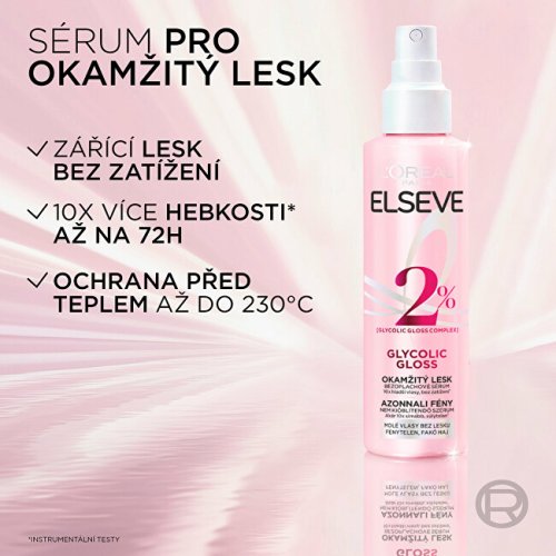 Ľahké sérum v spreji pre okamžitý lesk a intenzívnu hebkosť vlasov až na 72 hodín, a to bez zaťaženia. Vďaka obsahu kyseliny glykolovej dodáva vlasom až 10× viac hebkosti a zároveň ich chráni pred tepelným stylingom až do 230 °C. Ideálna ako záverečná starostlivosť pre lesklé, uhladené a zdravo vyzerajúce vlasy.