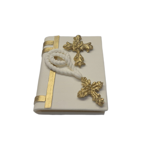 Ručne modelovaná kniha Biblie so zlatým krížom dodá tortám pre krst, prvé sväté prijímanie či birmovanie elegantnú, duchovnú a slávnostnú atmosféru.