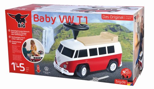 Detailne spracované odrážadlo v dizajne Volkswagen T1 s odnímateľným sedadlom, malým operadlom a zadným ťažným zariadením. S Baby VW T1 pridáva BIG do svojho medzitým diverzifikovaného vozového parku ďalšie klasické vozidlo. Jazdné vozidlo bolo v každom detaile vymodelované podľa svojho vzoru, Volkswagenu T1, a má množstvo funkčných vylepšení. Pod vyberateľným sedadlom s malým operadlom sa ukrýva priestranná priehradka, do ktorej je možné bezpečne uložiť osobné veci vodiča. Kolesá majú tiché pneumatiky, ktoré nezanechávajú stopy a nehrozí tak zanechanie odtlačkov na podlahe, a preto je karavan ideálny aj na vnútorné použitie. Max. nosnosť 50 kg. Rozmery: 60,5 x 23 x 37 cm. Váha 3,4 kg. S dvojplášťovým volantom s integrovaným mechanickým klaksónom. Baby VW T1 sa vyrába v modernej továrni BIG v Nemecku a bol testovaný na maximálnu bezpečnosť. Oficiálne licencované Volkswagenom.