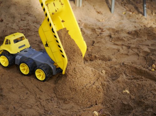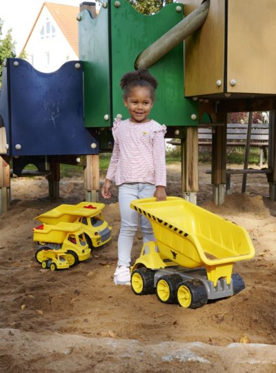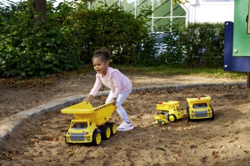 Mega sklápačka z robustného plastu, 6 kolies z mäkkého plastu, nezanecháva stopy na podlahe, kapacita 12,8 litrov alebo 25 kg. Jednoduchá údržba. Rozmery výrobku (DxŠxV) 65x31x36 cm.