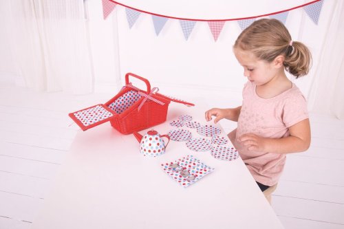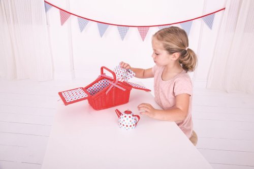 Táto nádherná bodkovaná čajová súprava obsahuje červený prútený kôš, v ktorom nájdete štyri šálky, štyri tanieriky, čajovú kanvicu s odnímateľným vekom a štyri lyžičky v obale. Súprava obsahuje všetko, čo deti potrebujú k čajovému dýchanku. Hlavné vlastnosti: vhodné aj na cesty skvelý spôsob, ako povzbudiť kreativitu a nápady zodpovedá súčasným európskym bezpečnostným normám