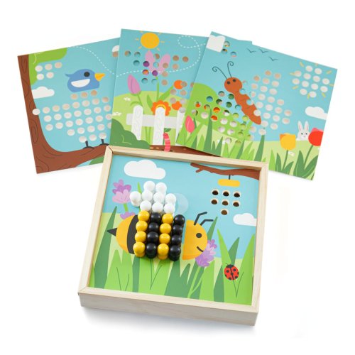 Rozohrajte obrázky s motívmi záhradky pomocou rôznofarebných kolíčkov. Umiestňujte ich v súlade s okolitými farbami, alebo podľa vlastnej fantázie. Nechajte deti hrou rozpoznávať farby, rozvíjať poznávacie schopnosti, sústredenie a zručnosť. Obrázky sa umiestňujú na veko kompaktnej krabičky, do ktorej môžete všetky súčasti prakticky uložiť. Mozaika tak môže byť vždy uprataná aj pripravená na cesty. Všetky súčasti sú vyrobené z kvalitného a zodpovedne získaného dreva, ktoré je príjemné na dotyk, a pomáha tak prirodzene stimulovať hmat. Hlavné vlastnosti:4 obrázky a 96 kolíčkov (8 rôznych farieb)praktické balenieatraktívne drevené spracovanie