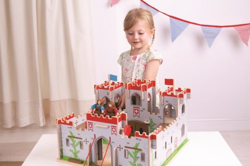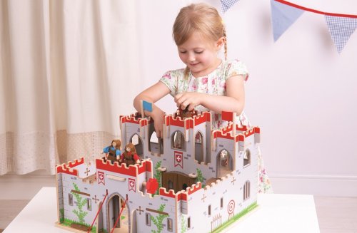 Drevený hrad kráľa George obsahuje plne funkčný padací most, balkóny a pohyblivé dvere. Nájdete tu aj tajné dvere, ktorými rytieri vykĺznu von bez toho, aby ich zbadal nepriateľ! Majte hrad pod kontrolou vďaka padaciemu mostu, vymieňajte červené a modré vlajky podľa toho, kto hrad dobyl. Užívajte si magickú hru, nezabudnite ale byť stále v strehu! Jednoducho zložte drevené dieliky do seba a dobrodružstvo môže začať. Je to skvelý spôsob ako rozvíjať rozprávačské zručnosti, slovnú zásobu a zručnosť u detí. Vyrobené z kvalitných materiálov zo zodpovedných zdrojov. Postavičky nie sú súčasťou balenia, dajú sa dokopiť. Hlavné vlastnosti: funkčný padací most, otváracie dvere vymeniteľné vlajky rozvíja komunikačné zručnosti, zručnosť a predstavivosť jednoduchá montáž