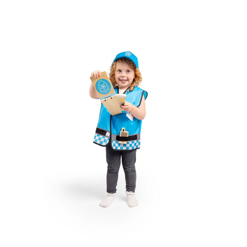 Malí hrdinovia môžu prísť na pomoc v tomto detskom kostýme policajta. Či už ide o chytanie zločincov, alebo pomáhanie ľuďom, možnosti predstieranej hry sú nekonečné. Vestu je možné prať v práčke, bavlnenú nastaviteľnú čiapku ručne. Testované podľa najnovších predpisov EN71 a REACH. Hlavné vlastnosti: príslušenstvo: drevená vysielačka, identifikačný odznak, peňaženka na doklady, svietidlo a pútavesta so suchými zipsami nastaviteľná čiapka (48 až 57 cm) vhodné pre deti od 3 do 5 rokovnápadité a detailné spracovanie