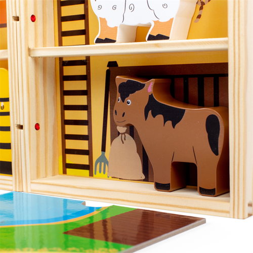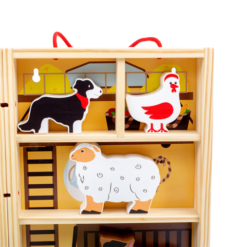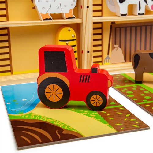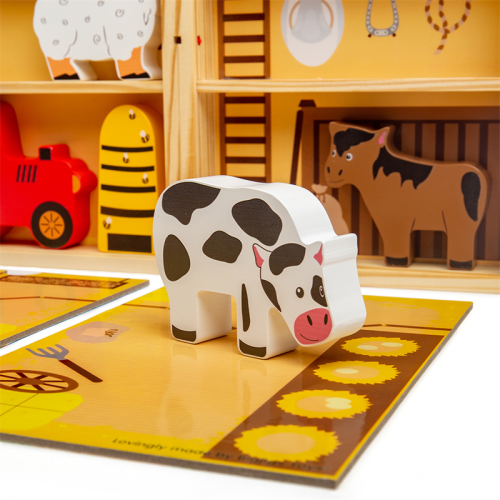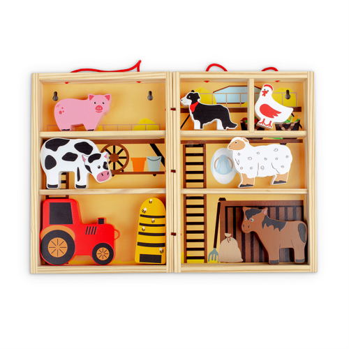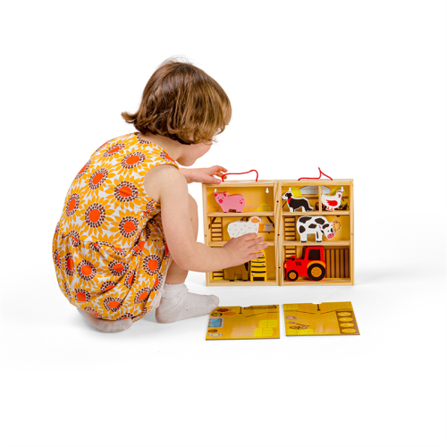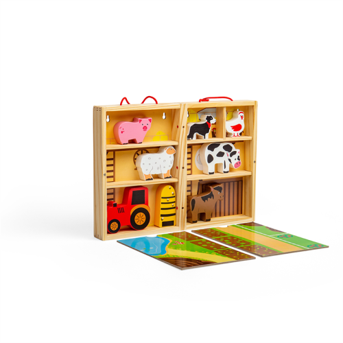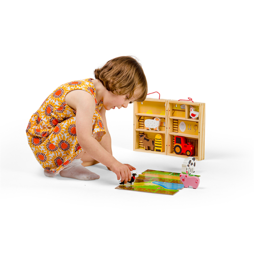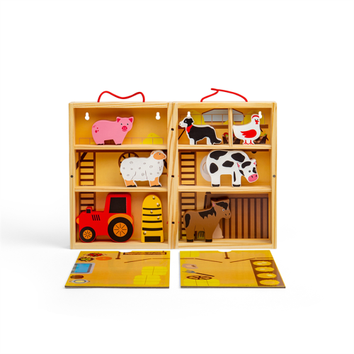 Prenosná krabička štylizovaná ako farma, ktorú so sebou môžete vziať kamkoľvek. Deti od 18 mesiacov môžu pomocou tejto hračky objavovať každodenné povinnosti farmárov. Podporuje kreativitu a predstavivosť. Hladké robustné hracie figúrky majú ideálnu veľkosť pre malé ručičky na uchopenie, skúmanie a výmenu. Hlavné vlastnosti: prenosnosť, ideálna na cestovanievyrobené z drevamasívne drevené zvieratká - kôň, krava, pes, prasa a ovceobsahuje hraciu škatuľu, rozkladajúcu hraciu podložku, zvieratká, včelí úľ a traktorvhodné od 18 mesiacov