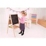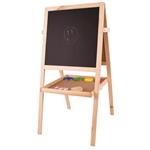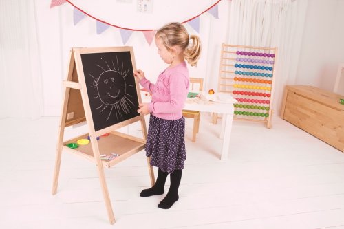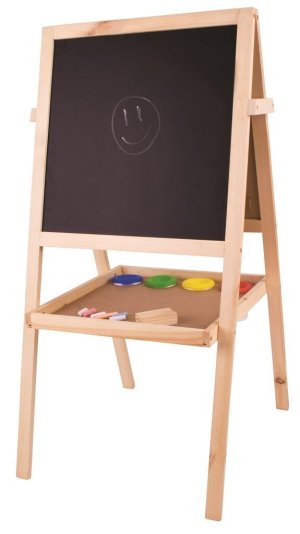S touto všestrannou tabuľou je možné ľahko rozvíjať kreatívne umelecké zručnosti detí. Z jednej strany magnetická tabuľa so suchým stieraním fixiek, z druhej strany tradičná tabuľa pre krídu . Súčasťou je rolka papiera, ktorú je možné ľahko upevniť na tyč skrytú medzi tabuľami v ich hornej časti, ďalej štyri nádobky na farby, guma a 12 farebných kried. Hlavné vlastnosti: vrátane príslušenstva vyrobené z kvalitných zodpovedne nakupovaných materiálov vyhovuje súčasným európskym bezpečnostným normám