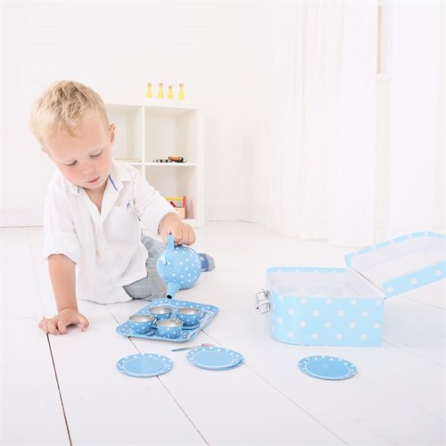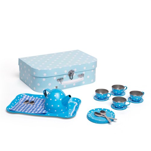 Táto nádherná bodkovaná čajová súprava obsahuje kartónový kufrík, v ktorom nájdete štyri kovové šálky a podšálky, čajovú kanvicu a lyžičky, tanieriky a servírovaciu tácku. Súprava obsahuje všetko, čo deti potrebujú k čajovému večierku. Hlavné vlastnosti: vhodné aj na cesty skvelý spôsob, ako povzbudiť kreativitu a nápady zodpovedá súčasným európskym bezpečnostným normám