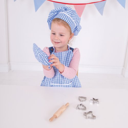 Mladí kuchári budú milovať túto svetlú a príjemne modrú bavlnenú sadu na pečenie alebo varenie, ktorá obsahuje zásteru, chňapku, kuchársku čiapku, valček a vykrajovače. Ideálne pre použitie v asistovanom varení alebo pečení, alebo pre použitie v našom drevenom kuchynskom sortimente, ako súčasť hracích rolí, ktoré si vaše dieťa určite rado stvárni. K dispozícii aj v ružovej farbe tu. Hlavné vlastnosti: čiapka: zapínanie na suchý zips, obvod cca 47-51 cmrukavice - dĺžka 17 cmzásterka - dĺžka: bez šnúrok 56 cm + šnúrky 29cm, šírka 46 cm + každá šnúrka 42 cm