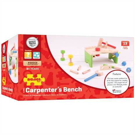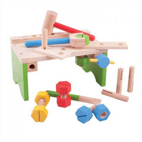 Tento šikovne navrhnutý drevený tesársky ponk obsahuje drevený kľúč, kladivo a množstvo skrutiek, matíc a zatĺkacích klátikov. Hlavné vlastnosti: vyrobené z kvalitných materiálov, zodpovedne získaných z prírodných zdrojov zodpovedá súčasným európskym bezpečnostným normám podporuje koordináciu rúk a očiskladá sa zo 14 hracích prvkov
