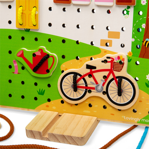 Prevliekací domček je šnurovacia hra plná zábavy. Pomocou farebných povrázkov dieťa prevlieka cez drevenú dosku s otvormi kúskami motívov, ako sú okná, bicykel, oblak a ďalšie. Môže si tak obrázok vytvoriť na množstvo rôznych variantov. Jasné žiarivé farby sú ideálne na stimuláciu predstavivosti. Táto zábavná prevliekacia hračka poskytne vášmu dieťatku hodiny zábavy. Je to skvelý spôsob, ako rozvíjať u vašej ratolesti koordináciu pohybov, jemnú motoriku, zručnosť a trpezlivosť . Vyrobené z vysoko kvalitných, zodpovedne získaných materiálov. Spĺňa aktuálne európske bezpečnostné normy. Hlavné vlastnosti: 30 dielov, 6 ks šnúrok krásne farebné spracovanie rozvíja jemnú motoriku vhodné od 3 rokov.
