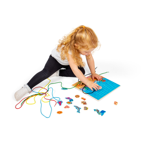Prevliekacia doska mora je šnurovacia hra plná zábavy. Pomocou farebných povrázkov dieťa prevlieka cez drevenú dosku s otvormi kúskami motívov z podmorského sveta. Môže si tak vytvoriť vlastný morský svet na množstvo rôznych variantov. Jasné žiarivé farby sú ideálne na stimuláciu predstavivosti. Táto zábavná prevliekacia hračka poskytne vášmu dieťatku hodiny zábavy. Je to skvelý spôsob, ako rozvíjať u vašej ratolesti koordináciu pohybov, jemnú motoriku, zručnosť a trpezlivosť. Vyrobené z vysoko kvalitných, zodpovedne získaných materiálov. Spĺňa aktuálne európske bezpečnostné normy. Hlavné vlastnosti: 30 dielov, 6 ks šnúrokkrásne farebné spracovanierozvíja jemnú motorikuvhodné od 3 rokov