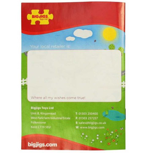 Rozložiteľný letáčik, v ktorom je vyobrazená časť ponuky drevených hračiek značky Bigjigs. Súčasťou balenia je 25 ks letáčikov. Celé balenie 25 kusov je určené iba veľkoobchodným zákazníkom. Maloobchodným zákazníkom môžeme zaslať na ukážku iba niekoľko kusov.
