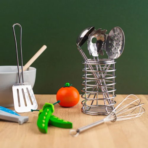 Za pomoci sady kuchynského náčinia bude varenie a pečenie hračkou! Sada určená pre malých kuchárov a kuchárky obsahuje šesť náčiní pre deti vrátane obracačky, dierovanej lyžice, naberačky, šľahacej metly, naberačky na špagety a varešky, uložené v praktickej valcovej nádobe. Deti môžu šľahať, miešať a servírovať a vyskúšajú si rôzne kuchynské činnosti a podporia tak svoju kreativitu. Hranie na role je skvelý spôsob, ako rozvíjať sociálnu inteligenciu, jazykové schopnosti, kreatívne myslenie a komunikačné zručnosti. Manipulácia s kuchynským náradím zlepšuje jemnú motoriku a koordináciu ruka-oko. Náčinie je vyrobené z prvotriednych kvalitných materiálov zo zodpovedných zdrojov a nafarbené netoxickými farbami a lakmi. Spĺňa aktuálne európske bezpečnostné normy. Hlavné vlastnosti: 6 ks kuchynského náčinia v nádobe: obracačka, dierovaná lyžica, naberačka, šľahacia metla, naberačka na špagety a vareška rozvíja sociálnu inteligenciu, jazykové schopnosti, kreatívne myslenie a komunikačné schopnosti zlepšuje jemnú motoriku a koordináciu rukovo