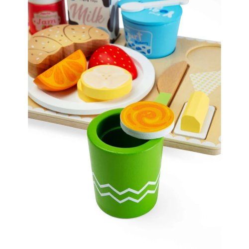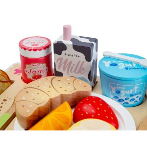 Táto drevená súprava prináša deťom zábavnú hru na servírovanie a starostlivosť o ostatných. Vďaka bohatému výberu raňajkových dobrôt môžu deti pripraviť a naservírovať kompletné raňajky rodičom, súrodencom alebo kamarátom a ponoriť sa do sveta každodenných situácií. Súprava obsahuje pestrú kombináciu jedla, nápojov i doplnkov, ktoré sú prehľadne usporiadané na drevenom podnose. Deti tak môžu trénovať skladanie, servírovanie aj organizáciu jednotlivých prvkov, čo podporuje jemnú motoriku aj koordináciu ruky a oka. Hra na role rozvíja fantáziu, komunikáciu aj sociálne zručnosti. Deti si môžu vytvárať vlastné príbehy – od raňajok do postele až po malú kaviareň alebo izbovú službu. Sada je navrhnutá tak, aby dobre padla do detských rúk a podporovala samostatnú aj spoločnú hru. Vyrobená je z kvalitného FSC® certifikovaného dreva, ktoré zaisťuje odolnosť aj šetrnosť k životnému prostrediu. Samozrejmosťou je aj splnenie bezpečnostných štandardov pre detské hračky. Hlavné vlastnosti: rozsiahla sada cca 28 dielov obsahuje raňajkové potraviny, nápoje i doplnky na servírovanie. Súčasťou je drevený podnos. Podporuje kreatívnu a imaginatívnu hru. (Forest Stewardship Council) zaručuje, že drevo, z ktorého bol produkt vyrobený, nebolo vyťažené nelegálne a pochádza z lesov obhospodarovaných šetrným či prírode blízkym spôsobom, v ktorom sú dodržiavané prísne environmentálne a sociálne požiadavky. Značka FSC® na výrobku znamená, že svojim nákupom pomáhate chrániť lesy a podporujete šetrné, zodpovedné či prírode blízke hospodárenie, vďaka ktorému sú naše lesy stabilnejšie, zdravšie, majú prirodzenú druhovú skladbu a lepšie odolávajú negatívnym následkom klimatických zmien.