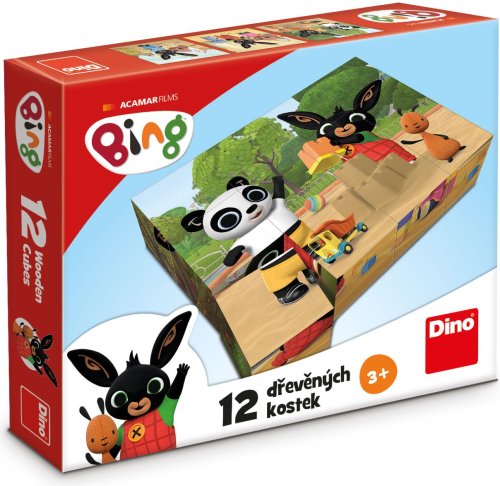 Detské drevené kocky, z ktorých je možné zostaviť 6 rôznych obrázkov. Balenie obsahuje 12 kociek. Vek: 3+