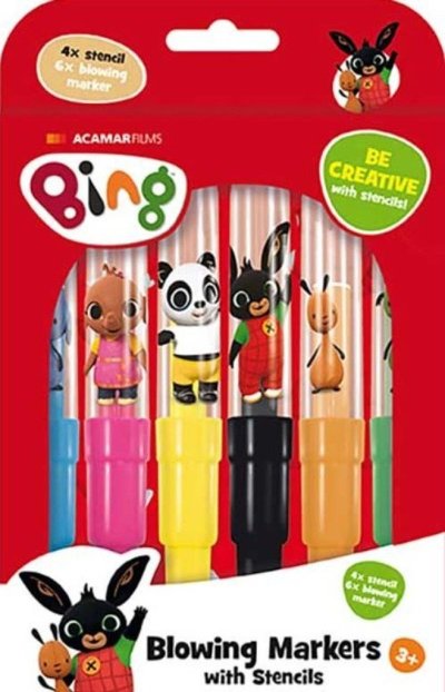 Balenie obsahuje 6 farebných fúkacích fixiek s potlačou a 4 farebné papierové šablónky v obľúbených motívoch.